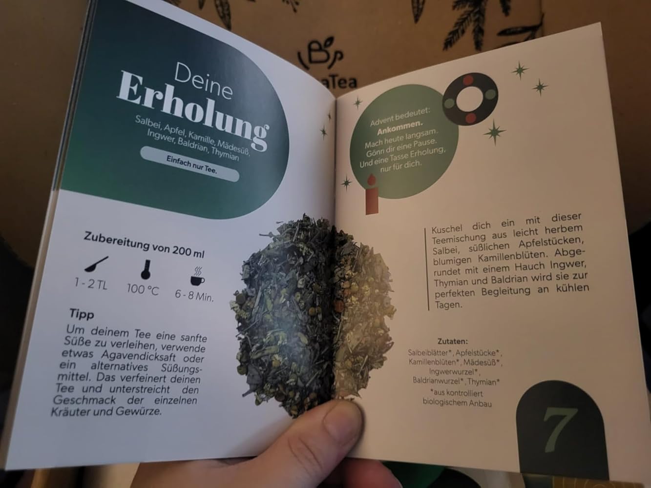 Zutaten: Bio Salbeiblätter, Bio Apfelstücke, Bio Kamillenblüten, Bio Mädesüß, Bio Ingwerwurzel, Bio Baldrianwurzel, Bio Thymian